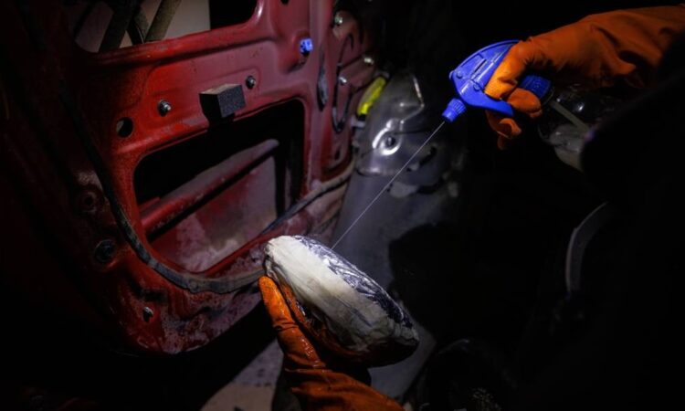 El hombre roció seis paquetes envueltos en aluminio con un líquido que olía a cloro, un compuesto que, según dijo, ayudaría a que los perros rastreadores no detectaran el fentanilo. Debajo del papel de aluminio, la droga mortal estaba envuelta en papel carbón para intentar evitar los métodos básicos de detección por rayos X, dijo.