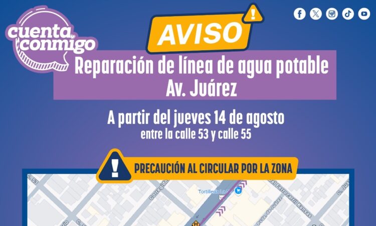 Una hora más tarde comenzarán las labores para la reparación de una fuga en la línea general de agua potable en la avenida Juárez, entre las calles 53 y 55.