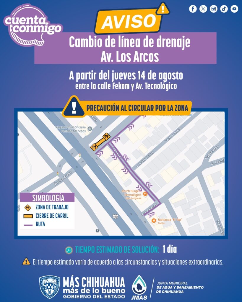 JMAS Chihuahua llama a los automovilistas a respetar en todo momento los señalamientos que se colocarán en ambas áreas, y a conducir con precaución para evitar accidentes.