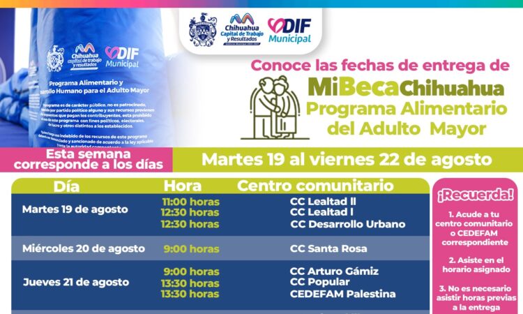 H. Ciudad de Chihuahua, Chih., a 17 de agosto de 2025.- El DIF Municipal informa a las y los beneficiarios del Programa Alimentario del Adulto Mayor (PAAM) los centros comunitarios y horarios en los que podrán acudir por su paquete alimentario del 19 al 22 de agosto: