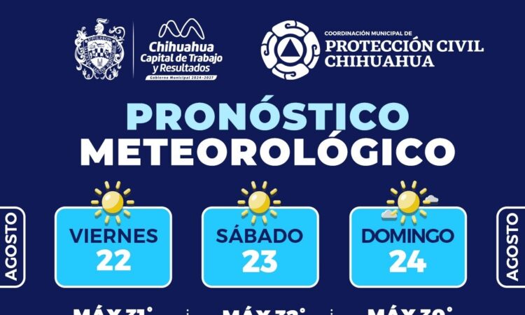 La Coordinación Municipal de Protección Civil informa que, para este fin de semana del 24 al 24 de agosto, se espera días mayormente soleados y muy baja probabilidad de precipitación.