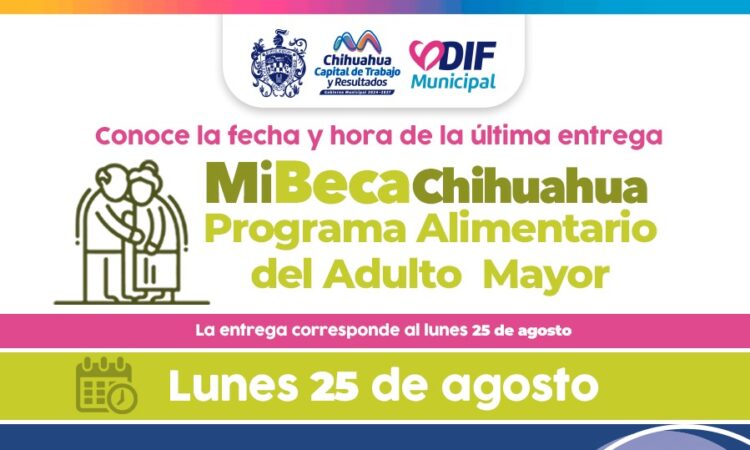 En atención al compromiso que el Gobierno Municipal tiene con las y los adultos mayores de Chihuahua Capital, para garantizarles una mejor calidad de vida, a través del DIF, se informa a las y los solicitantes del Programa Alimentario del Adulto Mayor (PAAM) que podrán acudir por su paquete alimentario este lunes 25 de agosto, en el CEDEFAM Punta Oriente, a las 9:00 am.