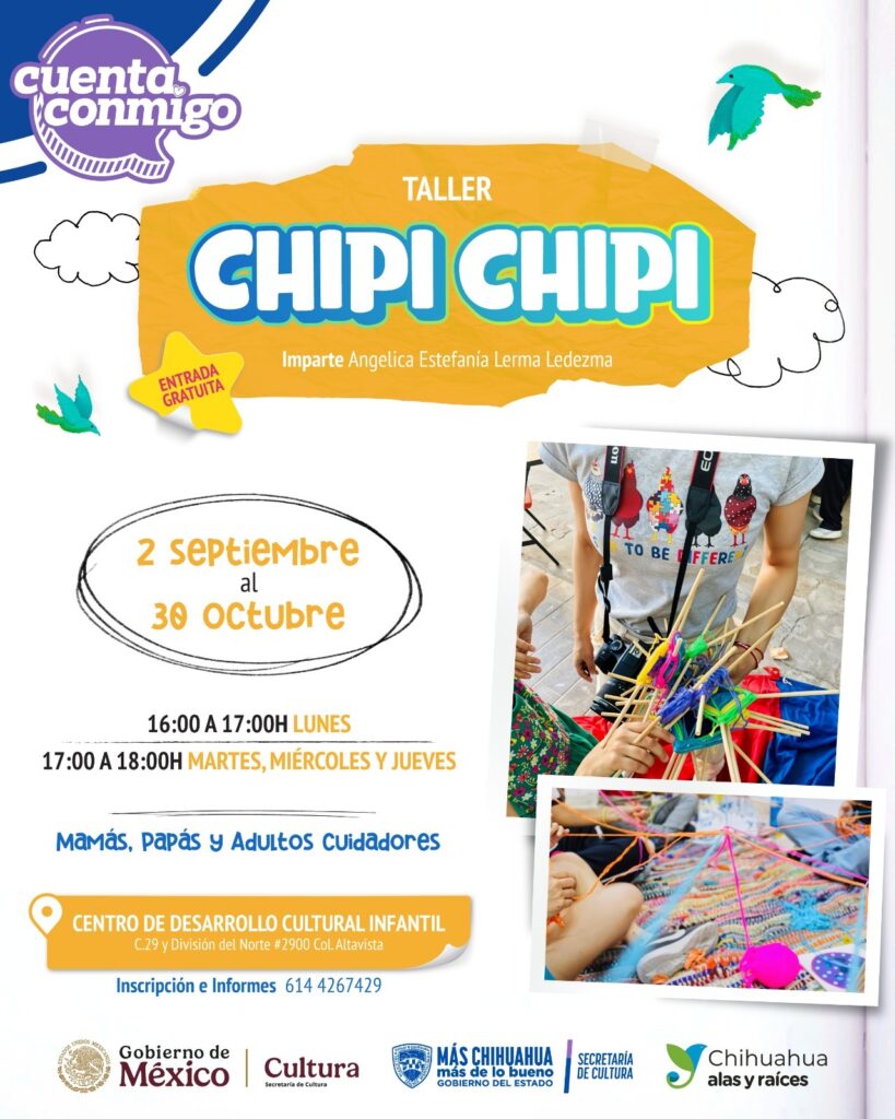 Finalmente, para madres, padres y adultos y creadores, se contará con el taller “Chipi Chipi” desde el 2 de septiembre al 30 de octubre con sesiones los días lunes de 4 a 5 de la tarde y martes, miércoles y jueves de 17:00 a 18:00 horas. Los mayores podrán disfrutar de danza, narraciones e instalaciones de juego.