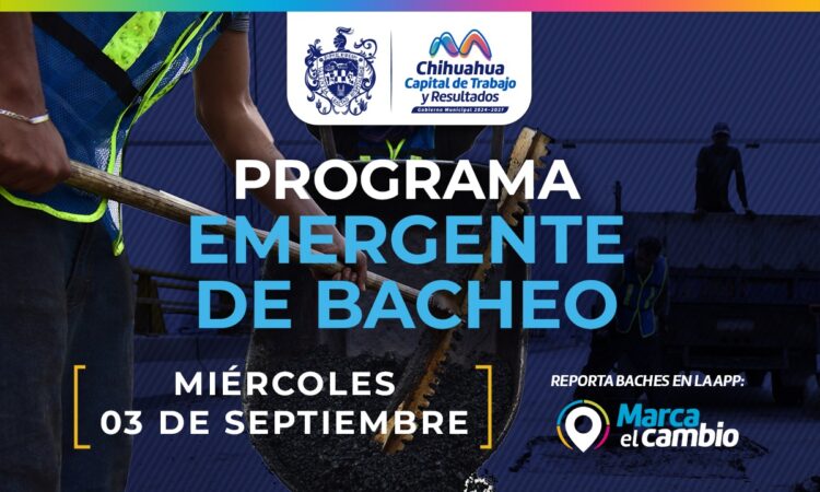 El Gobierno Municipal, a través de la Dirección de Obras Públicas, mediante el programa emergente bacheará este 3 de septiembre calles de las colonias Obrera, Rosario, Cerro de la Cruz, Francisco I. Madero y Parques de Oriente, así como en la avenida Tecnológico y periférico de la Juventud.