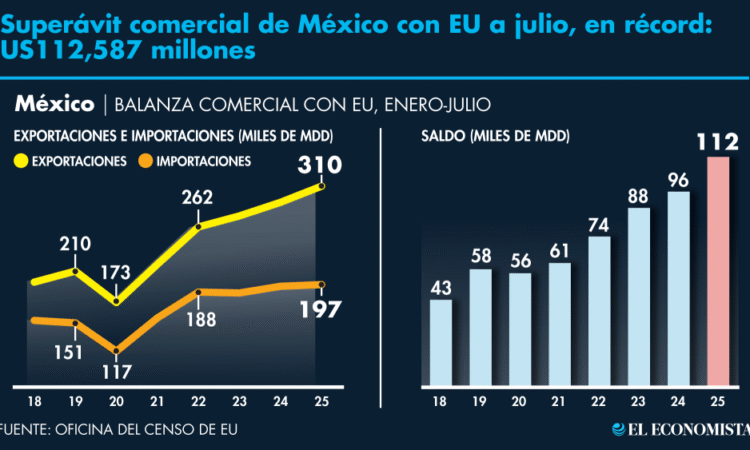 En el acumulado a julio, las exportaciones mexicanas a Estados Unidos se incrementaron 6.5%, llegando a 309,749 millones de dólares. Durante ese mismo periodo, las exportaciones estadounidenses de bienes al mercado mexicano aumentaron 1.1%, a 197,161 millones de dólares.
