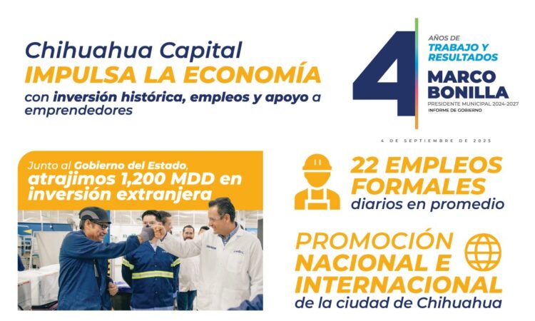 a economía de Chihuahua Capital avanza de manera positiva en este cuarto año de trabajo y resultados de la administración del alcalde Marco Bonilla. Con el apoyo del Gobierno del Estado la ciudad logró atraer 1,200 millones de dólares en inversión, lo que se traduce en más empleos, nuevas oportunidades para negocios locales y mayor prosperidad para las familias.