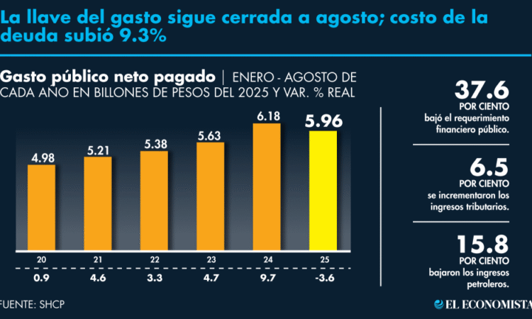 En el mismo periodo, el costo financiero de la deuda, una de las grandes presiones del gasto público, creció. Entre enero y agosto el gobierno destinó 820,820 millones de pesos al servicio de la deuda, 9.3% más en comparación anual.