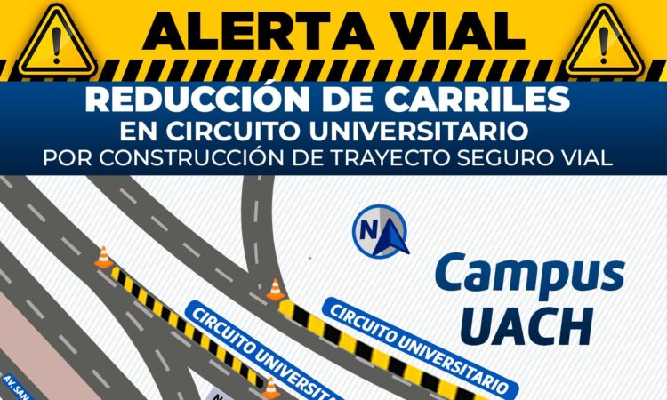 El Gobierno Municipal a través de la Dirección de Obras Públicas, emite una alerta vial por la reducción de carriles en el Circuito Universitario a la altura de la Facultad de Ingeniera de la UACH, en el sentido sur-norte debido a los trabajos de demolición de asfalto para la construcción de un paso peatonal pompeyano, como parte de la obra denominada Trayecto Vial Seguro.