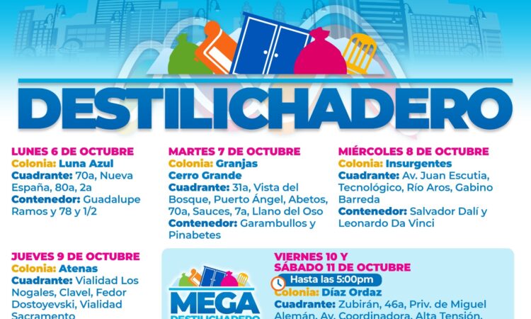 H. Para evitar acumulaciones de basura de grandes dimensiones en las viviendas, que podría generar plagas o problemas de salud, el Gobierno Municipal, a través de la Dirección de Servicios Públicos Municipales, informa el calendario del programa Destilichadero, que se realizará 6 al 11 de octubre en cinco colonias de la Capital.