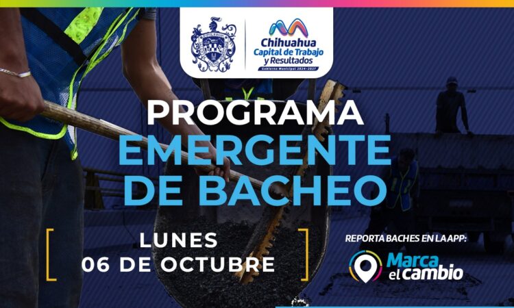 El Gobierno Municipal, a través de la Dirección de Obras Públicas, bacheará este 6 de octubre, mediante el programa emergente, en calles de las colonias Panorámico, Los Mezquites, Campo Bello y Arroyos, así como en la avenida Heroico Colegio Militar, Vialidad Los Nogales y el boulevard Ortiz Mena.