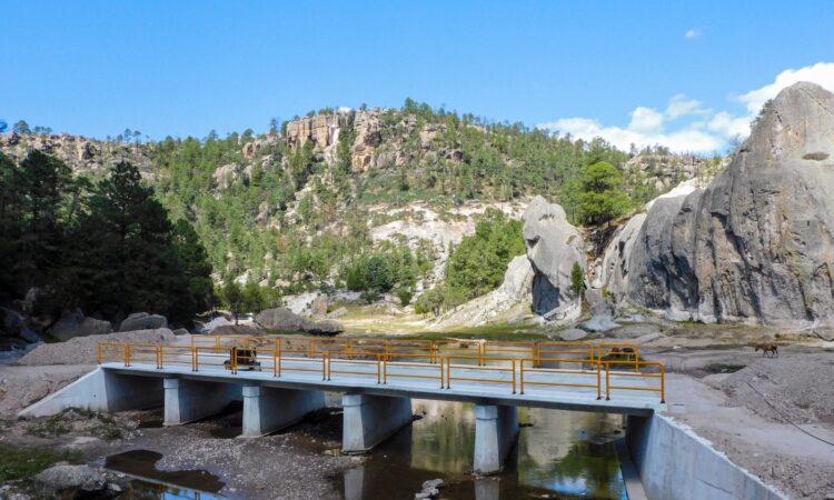 El Gobierno del Estado, a través de la Secretaría de Turismo informa que las obras de construcción de los dos puentes vehiculares que darán acceso a la Cascada de Cusárare, registran un 65 por ciento de avance y se prevé su conclusión antes de finalizar el año.