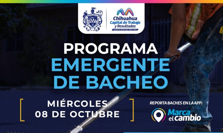 El Gobierno Municipal, a través de la Dirección de Obras Públicas, llevará a cabo trabajo de bacheo este 8 de octubre, mediante el programa emergente, en calles de las colonias: Industrial, Riberas de Sacramento, Rinconada Oriente, así como en las avenidas Juan Escutia, Tecnológico, boulevard Fuentes Mares y vialidad Los Nogales.