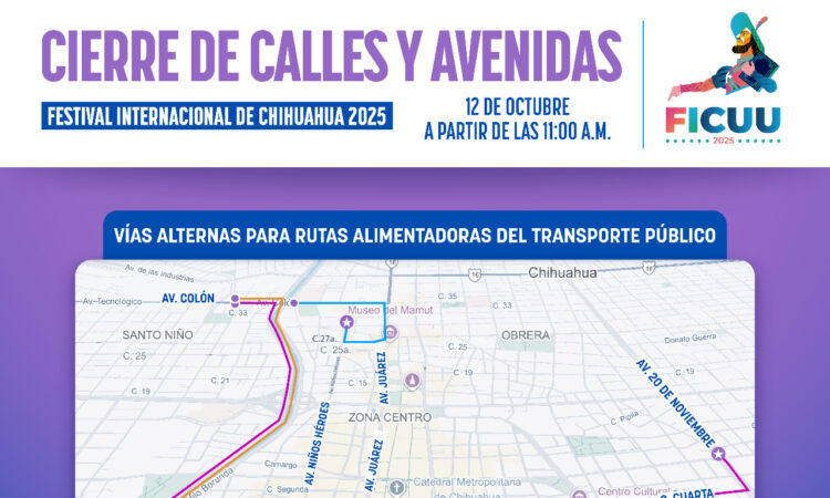 Este domingo 12 de octubre, cambiarán los recorridos del centro de la ciudad desde las 11 de la mañana hasta concluir el evento_ La Secretaría General de Gobierno, a través de la Subsecretaría de Transporte, da a conocer las modificaciones temporales en distintas rutas de los servicios de Transporte y Colectivo Urbano para este domingo 12 de octubre, por el Festival Internacional de la Ciudad de Chihuahua (FICUU) 2025. Lo anterior, debido al cierre de avenidas principales del primer cuadro de la capital, con cambios en el recorrido de las unidades desde las 11 de la mañana hasta finalizar el evento.*Modificación en rutas de norte a centro*Auxiliar Pistolas Meneses