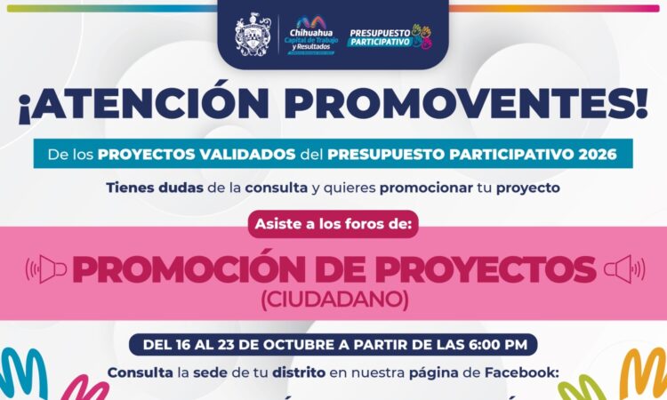 El Gobierno Municipal, a través de la Coordinación de Participación Ciudadana, invita promoventes que probaron sus propuestas para el “Presupuesto Participativo 2026”, a asistir a los Foros de Promoción de Proyectos.