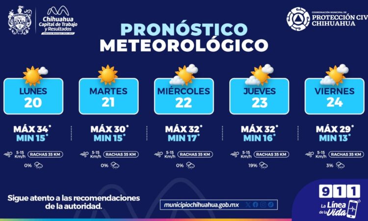 Con base en la información emitida por el Servicio Meteorológico Nacional (SMN), el Gobierno Municipal de Chihuahua, a través de la Coordinación Municipal de Protección Civil, informa el pronóstico del clima para esta semana, en la cual se esperan días mayormente soleados con ligeras probabilidades de lluvia hacia el jueves y viernes, además de temperaturas cálidas durante el día y frescas por la noche.