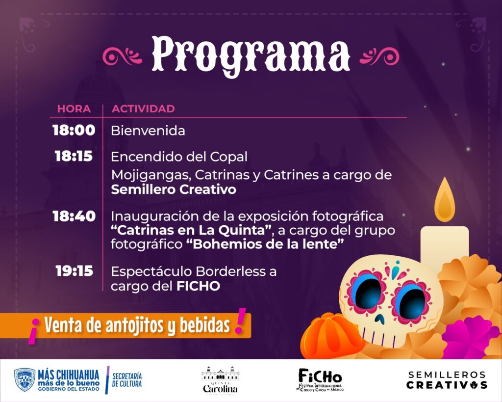 Contempla una ceremonia de bienvenida, venta de antojitos y bebidas por emprendedores locales, posteriormente se hará el encendido del Copal a cargo de Semillero Creativo Los Mojigangas, y las Catrinas y Catrines, programado para las 18:15.