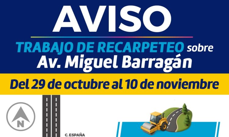 El Gobierno Municipal, a través del Consejo de Urbanización Municipal (CUM), emite una alerta vial por los próximos trabajos de recarpeteo en el tramo de la avenida Miguel Barragán que abarca de la calle Gabriela Mistral hasta la calle España, de Sur a Norte, por lo que se exhorta a la ciudadanía a circular con precaución por el sector.