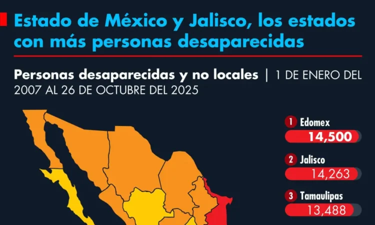 Entre el 1 de enero de 2007 y el 26 de octubre de 2025, en el Estado de México se han reportado alrededor de 14.500 personas desaparecidas y en Jalisco aproximadamente 14,263.