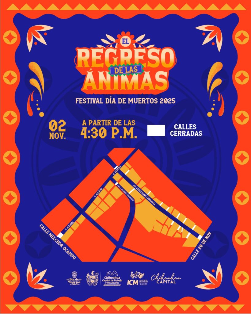 El Gobierno Municipal de Chihuahua, a través del Instituto de Cultura, invita a toda la comunidad a disfrutar del Desfile de Catrinas “El Regreso de las Ánimas”, evento principal del Festival de Día de Muertos 2025, este domingo 2 de noviembre a partir de las 6:00 pm en el Centro Histórico de la ciudad.