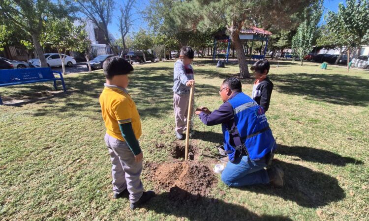 Las niñas y niños de la escuela Primaria Jesús Reyes Heroles, plantaron junto con personal del Gobierno Municipal y vecinos del sector Alamedas, 20 árboles de especies como encino siempre verde y palo verde en el parque Rafael Muñoz.