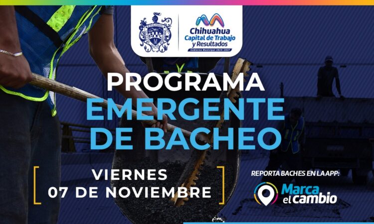 El Gobierno Municipal, a través de la Dirección de Obras Públicas, realizará trabajos de bacheo este 7 de noviembre, mediante el programa emergente, en calles de las colonias: Ávalos, Margarita Maza de Juárez, Misión del Bosque, Revolución, Villa del Real y Villa Dorada.