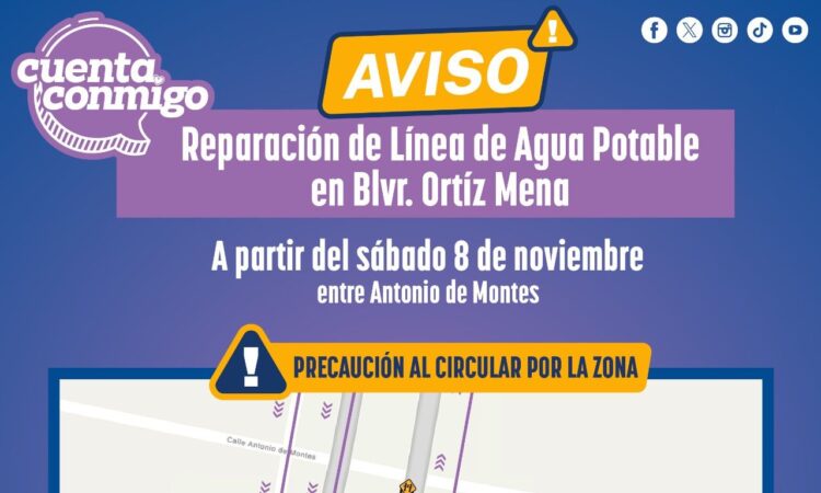 La Junta Municipal de Agua y Saneamiento (JMAS) Chihuahua informó que este sábado 8 de noviembre, será reparada una línea de conducción de agua potable de 12 pulgadas de diámetro, a la altura del cruce del bulevar Ortiz Mena y calle Antonio de Montes.