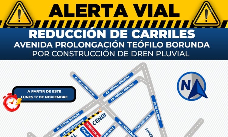 El Gobierno Municipal, a través de la Dirección de Obras Públicas, reitera a la ciudadanía la reducción de carriles en la avenida prolongación Teófilo Borunda, debido a la construcción de un dren pluvial en la colonia Barrio el Bajo, obra del programa Presupuesto Participativo que busca mejorar la conducción del agua pluvial y prevenir inundaciones en la zona.