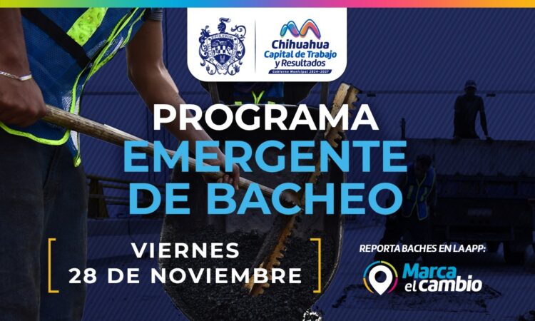 El Gobierno Municipal, a través de la Dirección de Obras Públicas, realizará trabajos de bacheo este viernes 28 de noviembre, mediante el programa emergente en calles de las colonias: Alamedas, Saucito, Infonavit Nacional así como en las avenidas 20 de noviembre y Pacheco