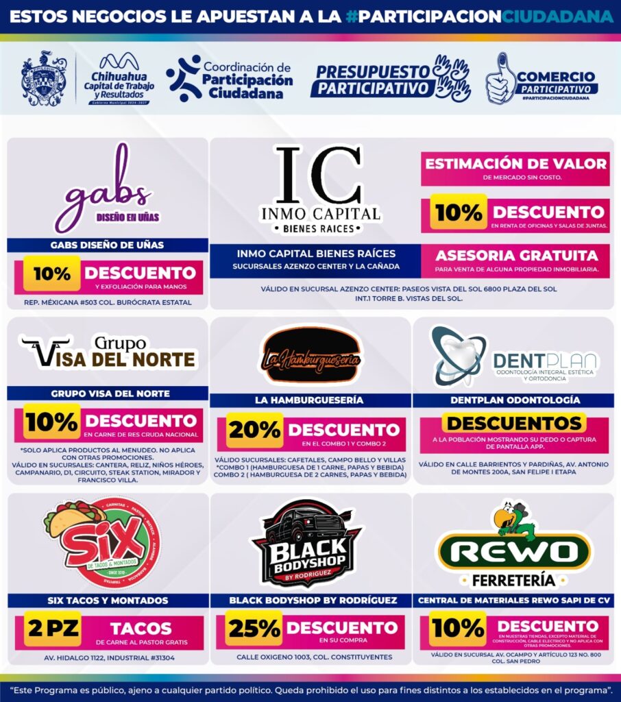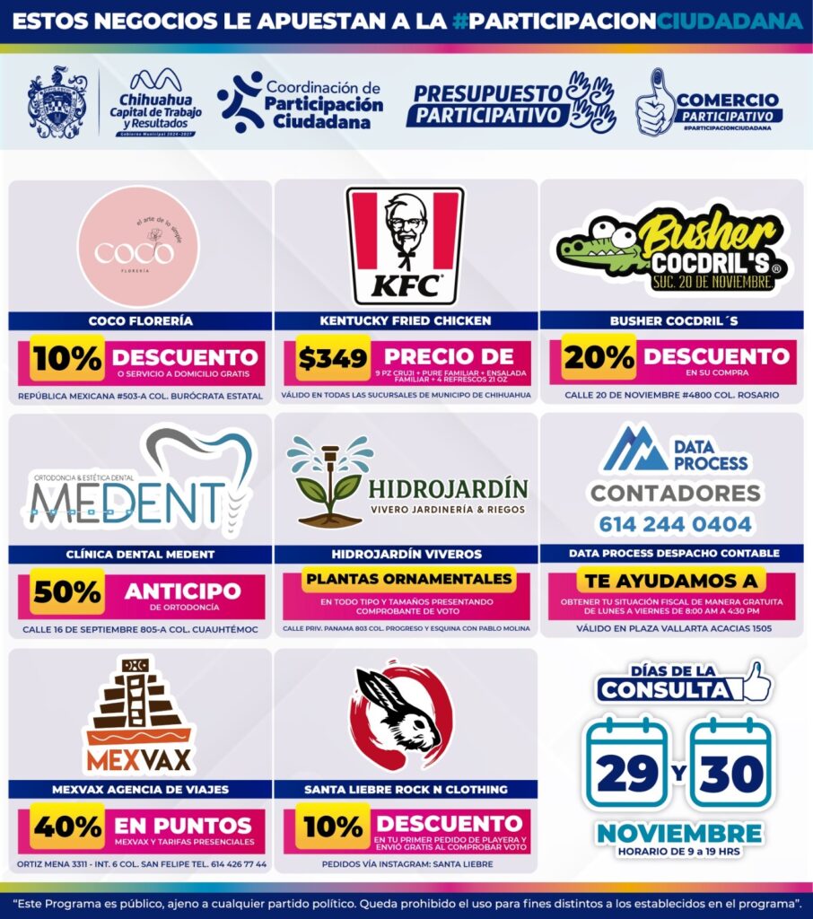 Los comercios forman parte de una iniciativa colaborativa que busca incentivar la participación ciudadana y fortalecer el vínculo entre el sector productivo y la comunidad. Los descuentos aplicarán únicamente durante los días de votación y deberán presentarse los comprobantes correspondientes.