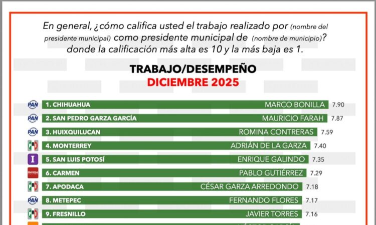 Con estos indicadores, Marco Bonilla cierra diciembre y el año como el alcalde mejor evaluado de México, liderando los rubros de trabajo, resultados y cercanía, y posicionando a Chihuahua Capital como una de las ciudades con mejor desempeño en servicios públicos y seguridad a nivel nacional.
