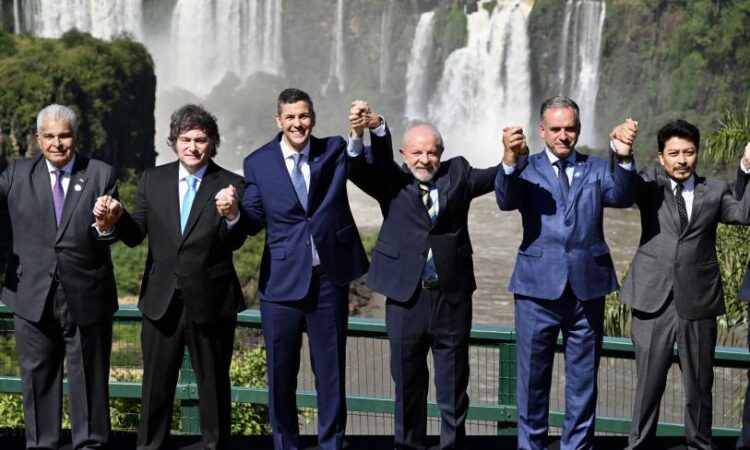 El presidente de Panamá, José Raúl Mulino, el presidente de Argentina, Javier Milei, el presidente de Paraguay, Santiago Peña, el presidente de Brasil, Luiz Inácio Lula da Silva, el presidente de Uruguay, Yamandu Orsi, y el ministro de Relaciones Exteriores de Bolivia, Fernando Aramayo, posan para una foto familiar durante la Cumbre de Jefes de Estado del Mercosur en las Cataratas del Iguazú en Foz de Iguazú, Estado de Paraná, Brasil, el 20 de diciembre de 2025.AFP