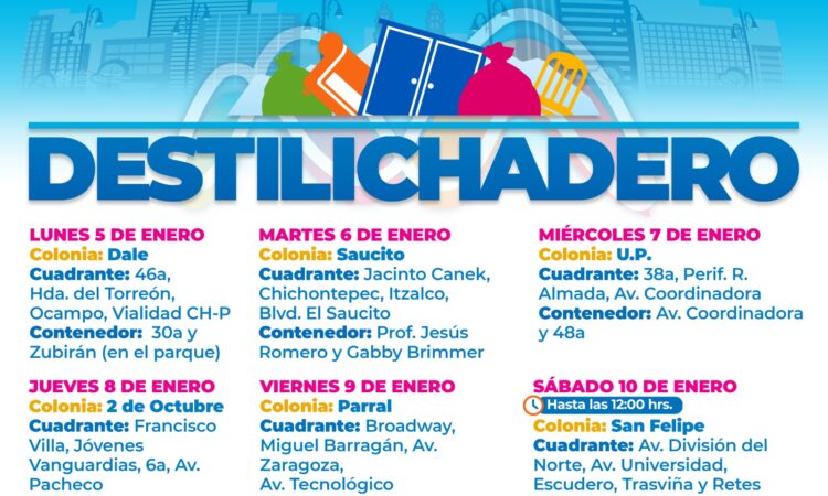 Para evitar acumulaciones de basura de grandes dimensiones en las viviendas, que podría generar plagas o problemas de salud, el Gobierno Municipal, a través de la Dirección de Servicios Públicos Municipales, informa el calendario del programa Destilichadero, que se realizará en seis colonias de la capital del del 5 al 10 de enero