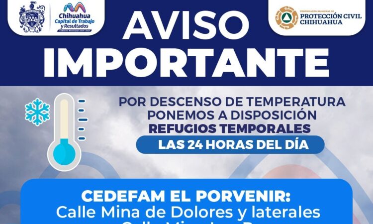 El Gobierno Municipal, a través del DIF y la Coordinación Municipal de Protección Civil, informa que, ante las bajas temperaturas donde pronostican mínimas de hasta -3°C para este fin de semana, del 9 al 11 de enero, se mantendrán habilitados las 24 horas los refugios temporales para resguardar a las personas que lo necesiten.