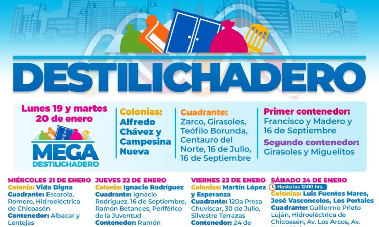 Asimismo, esta semana también habrá un Mega Destilichadero en las colonias Alfredo Chávez y Campesina Nueva el lunes 19 y martes 20 de enero, donde se instalarán dos contenedores, además de la presencia de diversas dependencias municipales.