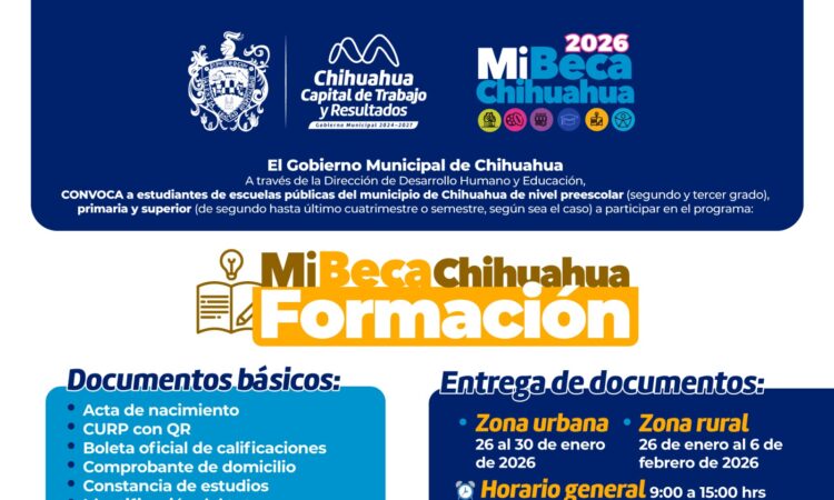El Gobierno Municipal de Chihuahua, a través de la Dirección de Desarrollo Humano y Educación, invita a estudiantes de escuelas públicas del municipio de Chihuahua de nivel preescolar (segundo y tercer grado), primaria y nivel superior (del segundo al último cuatrimestre o semestre) a participar en el programa Mi Beca Chihuahua Formación 2026, cuyo objetivo es apoyar la permanencia y conclusión de los estudios mediante un apoyo económico.
