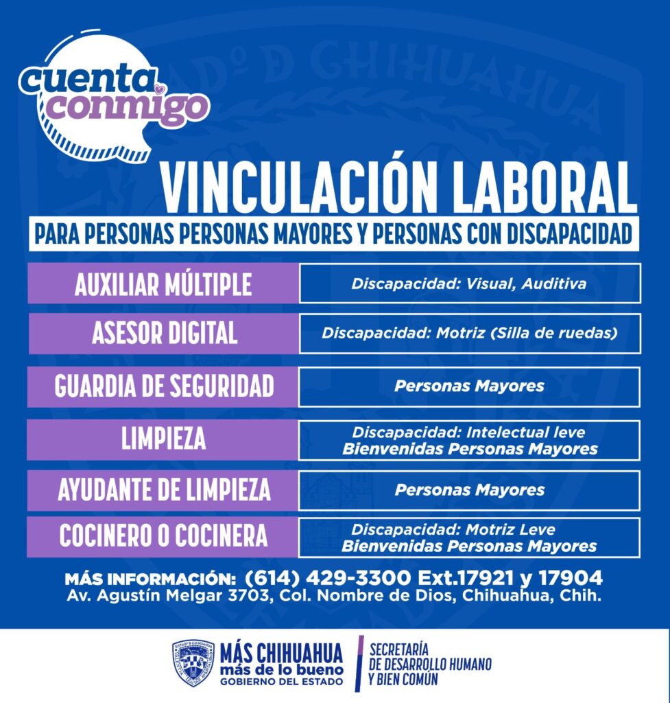 El Gobierno del Estado, a través de la Secretaría de Desarrollo Humano y Bien Común (SDHyBC) informó que hay disponibles nuevas vacantes de trabajo dirigidas a personas con discapacidad y adultas mayores, en los municipios de Chihuahua y Juárez.