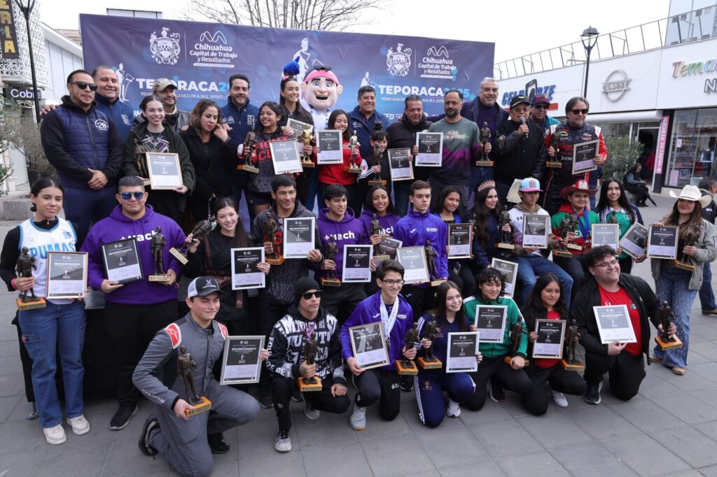 Deportistas del Municipio de Chihuahua, ganadores del Premio Municipal a la Excelencia en el Deporte “Teporaca” expusieron con orgullo sus estatuillas en el desfile que se realizó este sábado por las calles del centro de la ciudad; un contingente que encabezaron las ganadoras de oro y plata, Victoria Chávez de tochito bandera y Mía Michelle Gómez de ráquetbol.