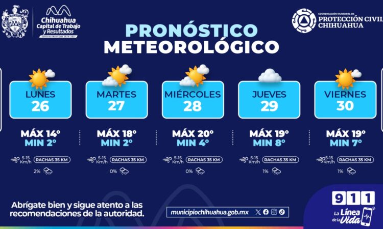 La Coordinación Municipal de Protección Civil informa que, durante la semana del lunes 26 al viernes 30 de enero, se pronostica que continúen las bajas temperaturas con mañanas frías en la ciudad.