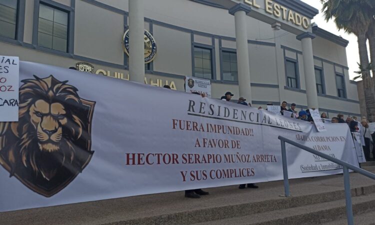 Habitantes del residencial Leones, ubicado sobre la carretera a Aldama, realizaron una manifestación este martes en el primer cuadro de la ciudad, donde bloquearon el Paseo Bolívar como medida de presión para exigir avances en diversas denuncias interpuestas ante la Fiscalía General del Estado (FGE).