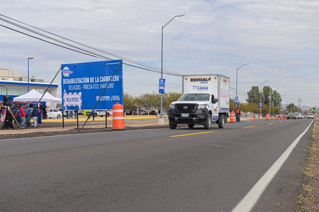 En el camino que conduce a la presa Francisco I. Madero, inauguró la rehabilitación de 132 kilómetros de ocho carreteras que conectan a Delicias con los municipios de Satevó, Valle de Zaragoza, Parral, Rosales, Meoqui, Saucillo y Julimes, con una inversión de 269 mdp.
