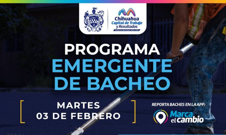 El Gobierno Municipal, a través de la Dirección de Obras Públicas, realizará trabajos de bacheo este martes 3 de febrero mediante el programa emergente en calles de las colonias: Ranchería Juárez, Mármol II, La Cima, Francisco Villa e Infonavit Nacional.