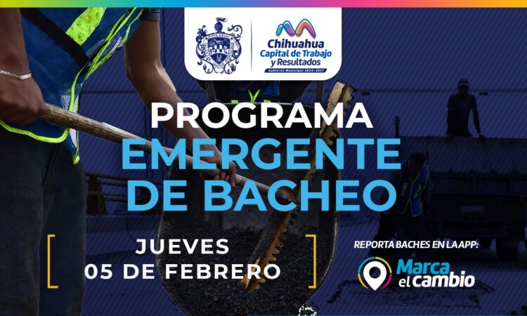 El Gobierno Municipal, a través de la Dirección de Obras Públicas, realizará trabajos de bacheo este jueves 5 de febrero mediante el programa emergente en calles de las colonias: Misión Universidad y Rinconada los Nogales, así como en las avenidas Heroico Colegio Militar y 20 de Noviembre, periférico Lombardo Toledano y en el Ejido Ciénega de Ortiz.