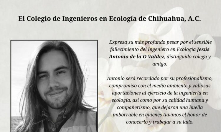 El Colegio de Ingenieros en Ecología de Chihuahua, A.C., expresó su más profundo pesar por el sensible fallecimiento del ingeniero en Ecología Jesús Antonio de la O Valdez, a quien reconocieron como un distinguido colega y amigo, recordado por su profesionalismo, compromiso con el medio ambiente y valiosas aportaciones al ejercicio de la ingeniería en ecología.