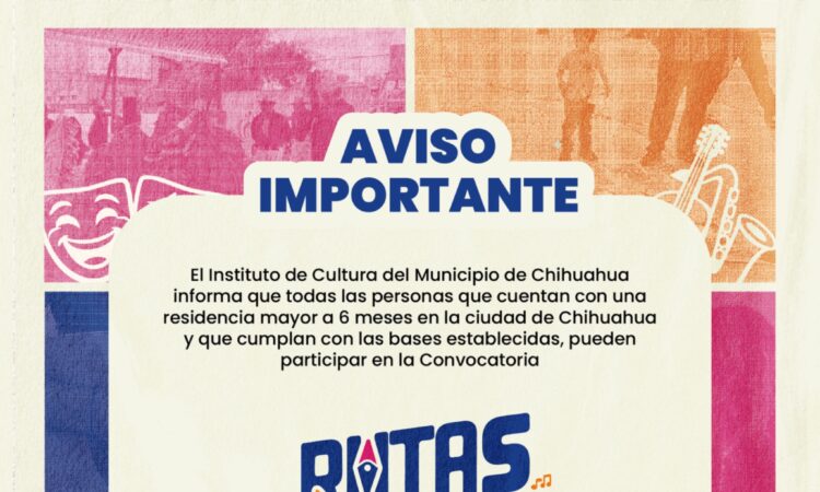 El Gobierno Municipal de Chihuahua, a través del Instituto de Cultura del Municipio, invita a la comunidad artística local a participar en la convocatoria Rutas Culturales 2026, un programa que busca llevar el arte y la cultura a distintos espacios públicos de la ciudad, al mismo tiempo que impulsa y da visibilidad al talento chihuahuense.