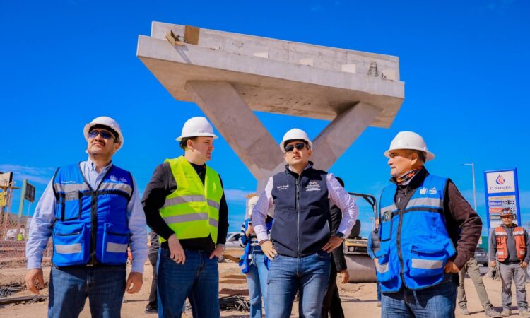 H. Ciudad de Chihuahua, Chih., a 16 de febrero de 2026.- El alcalde Marco Bonilla supervisó los trabajos de montaje de trabes en el cuerpo norte del Paso Superior de la Vialidad Los Nogales e Industrias, obra con la que se busca fortalecer la movilidad en el norte de Chihuahua Capital.
