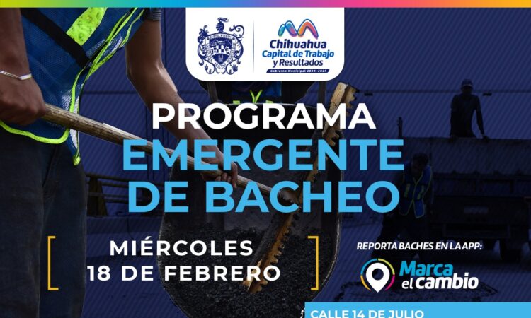 El Gobierno Municipal, a través de la Dirección de Obras Públicas, realizará trabajos de bacheo este miércoles 18 de febrero mediante el programa emergente en las calles 14 de Julio, Mariano Samaniego, Urquidi y Del Bosque, así como en las colonias Alamedas, Los Mezquites y Arboledas además de las avenidas Central y Palestina.