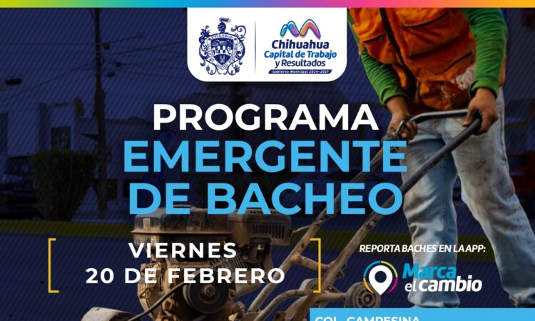 l Gobierno Municipal, a través de la Dirección de Obras Públicas, realizará trabajos de bacheo este viernes 20 de febrero mediante el programa emergente en calles de las colonias: Campesina, Praderas del Sur, Los Fresnos, Las Granjas, Los Arcos, Los Olivos, Martín López, Villas del Rey y San Felipe Viejo.