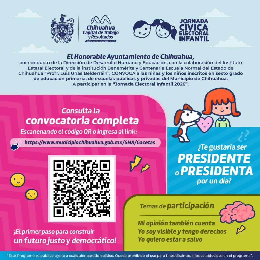 El Gobierno Municipal de Chihuahua, a través de la Dirección de Desarrollo Humano y Educación, recuerda que esta es la última semana para para participar en la Jornada Cívica Electoral Infantil 2026, en el marco del Día de la Niñez.