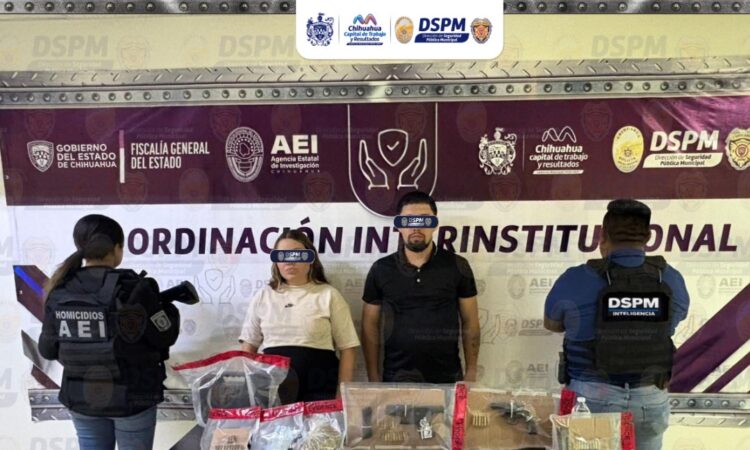 Gracias a una investigación efectuada con apoyo de tecnología de la Plataforma Escudo Chihuahua y la coordinación entre agentes de la Subdirección de Inteligencia de la DSPM y la Agencia Estatal de Investigación, AEI, se logró la orden de cateo para ingresar a un domicilio donde se detuvo a una pareja y el aseguramiento de dos armas de fuego, cartuchos y posible droga.