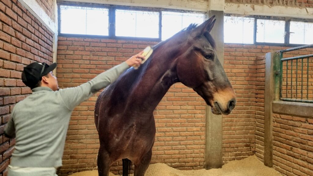 Eligio Castillo, caballerango del grupo, explica que los cuidados van desde la alimentación e hidratación diaria hasta el aseo y cepillado constante. También se realiza el cambio de “cama”, elaborada con aserrín, y se mantiene una observación permanente para detectar a tiempo cualquier lesión, dolor o molestia que deba ser reportada al veterinario.